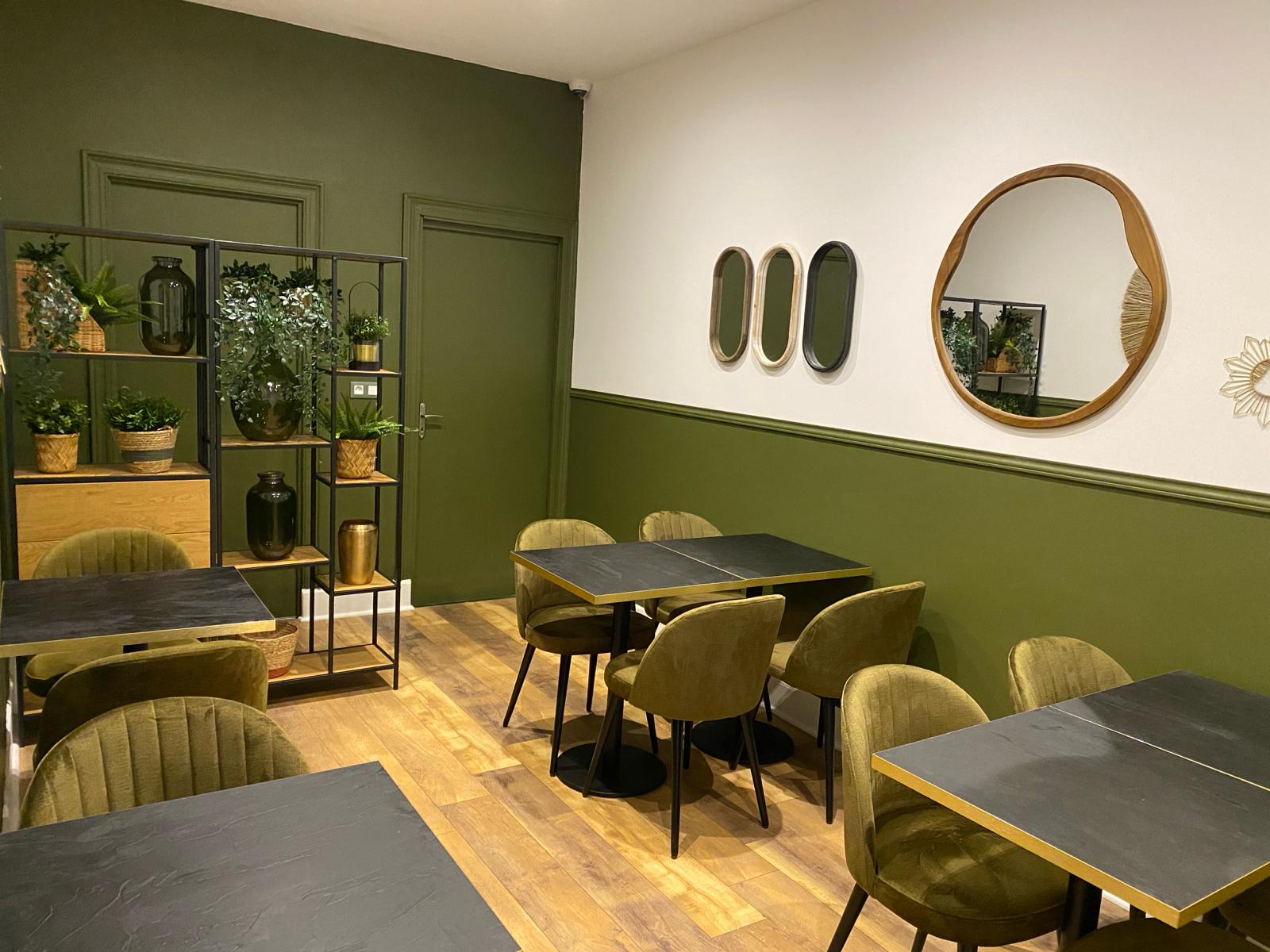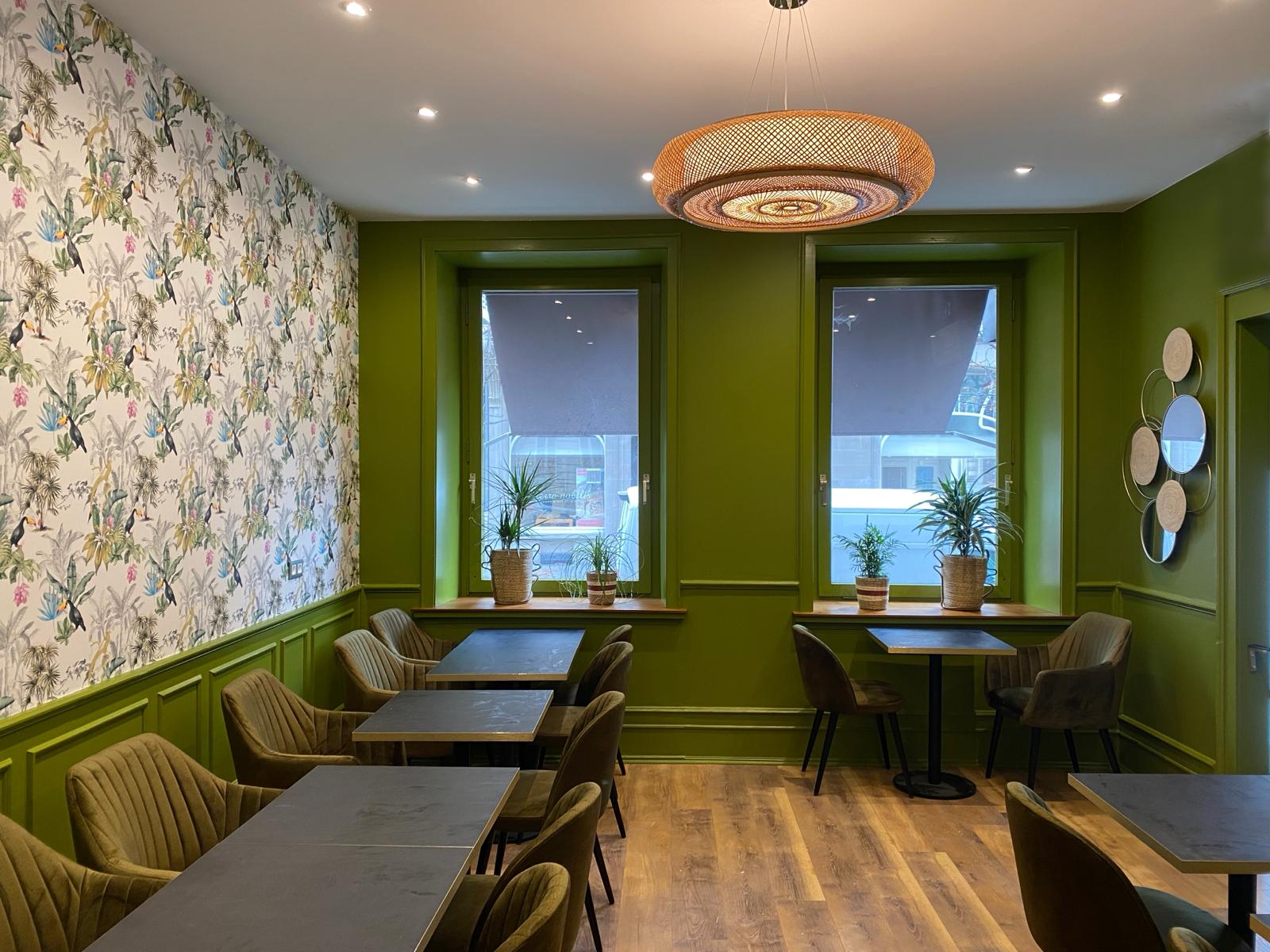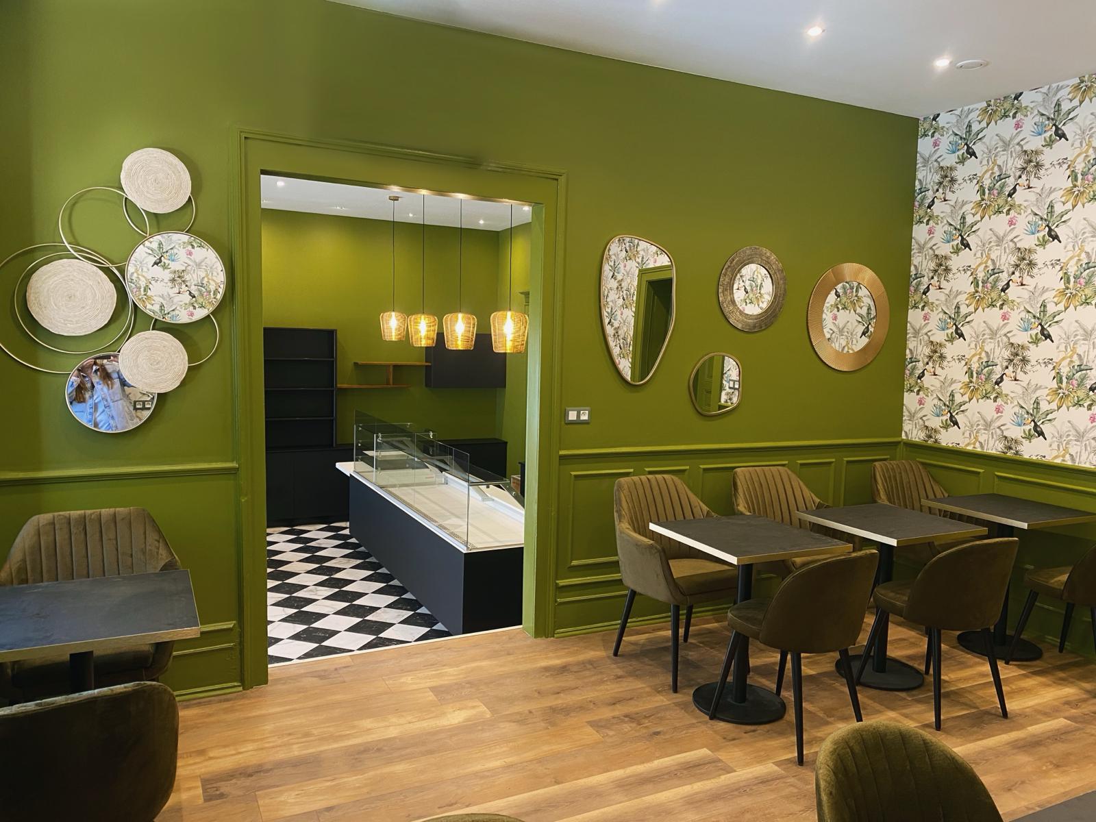 Dans le projet Falcinella, l'entrée du salon de thé et de son nouveau restaurant se fait par la patisserie. On voyage dans une atmosphère végétale apaisante. Des choix de couleurs aux éléments décoratifs en passant par le mobilier sur mesure, chaque aspect de l'aménagement contribue à créer une ambiance accueillante et élégante.
