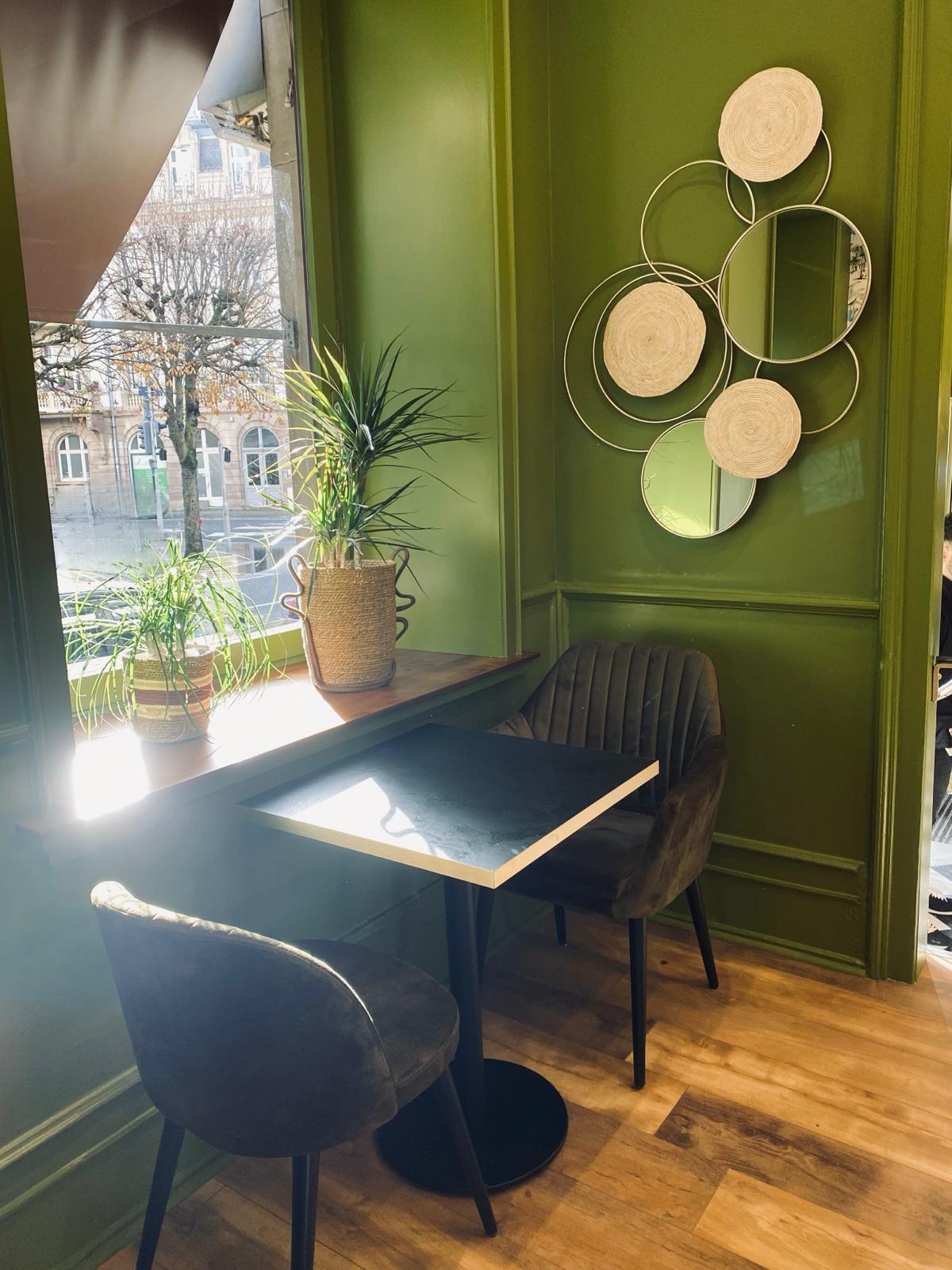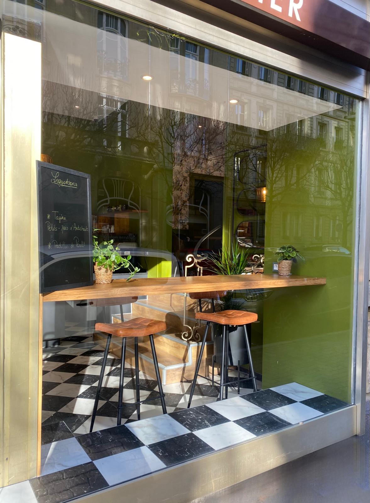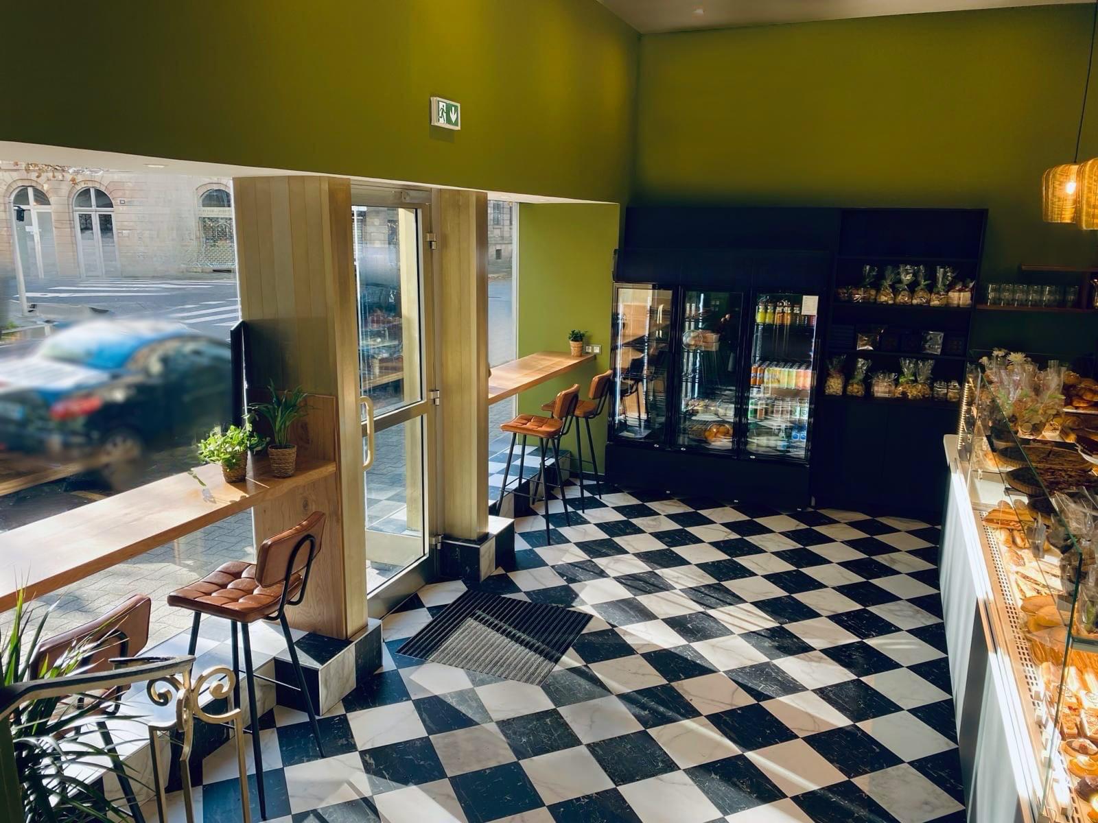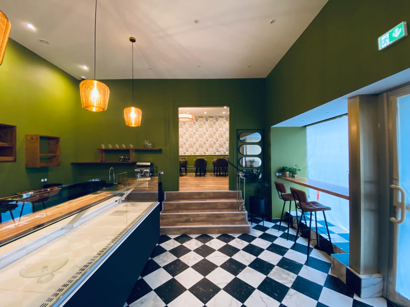 Dans le projet Falcinella, l'entrée du salon de thé et de son nouveau restaurant se fait par la patisserie. On voyage dans une atmosphère végétale apaisante. Des choix de couleurs aux éléments décoratifs en passant par le mobilier sur mesure, chaque aspect de l'aménagement contribue à créer une ambiance accueillante et élégante.